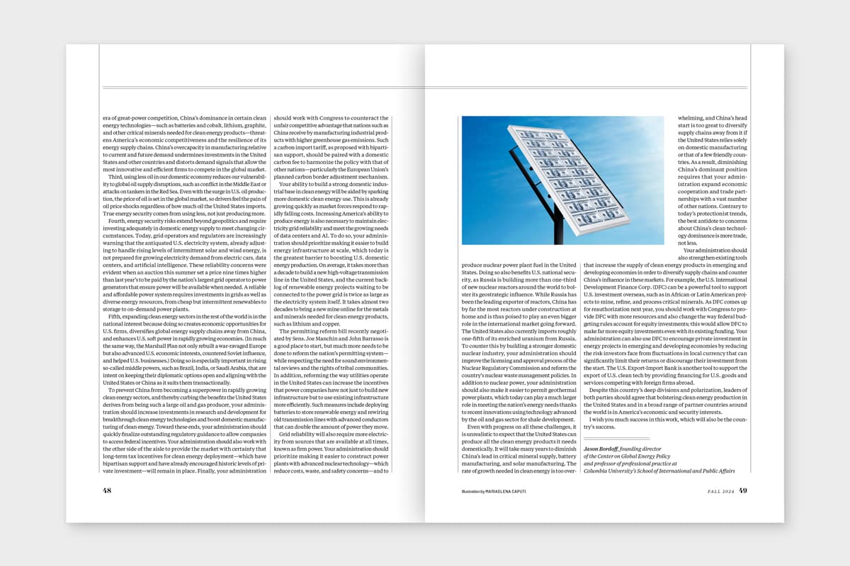 Clean-Energy-is-Security-layout A letter from Jason Bordoff to the next U.S. president about the importance of investing in clean energy technologies. By admin|2024-10-03T18:05:26+02:00October 3rd, 2024|0 Comments Share This Story, Choose Your Platform! FacebookXRedditLinkedInWhatsAppTumblrPinterestVkEmail About the Author: admin Leave A Comment Cancel replyComment Save my name, email, and website in this browser for the next time I comment.